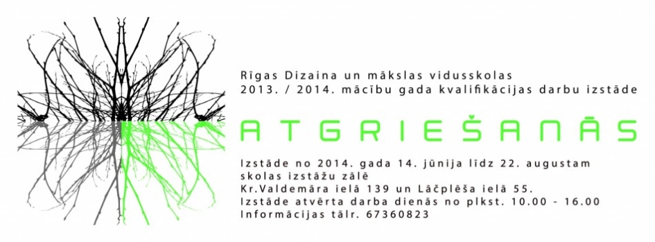 2013./2014. mācību gada Rīgas Dizaina un mākslas vidusskolas kvalifikācijas darbu izstādi “Atgriešanās” varēs apskatīt no 14. jūnija līdz 22. augustam skolas izstāžu zālē K. Valdemāra ielā 139 un Lāčplēša ielā 55. Modes skate norisināsies 14. jūnijā plkst. 14:00 K. Valdemāra ielā 139.
