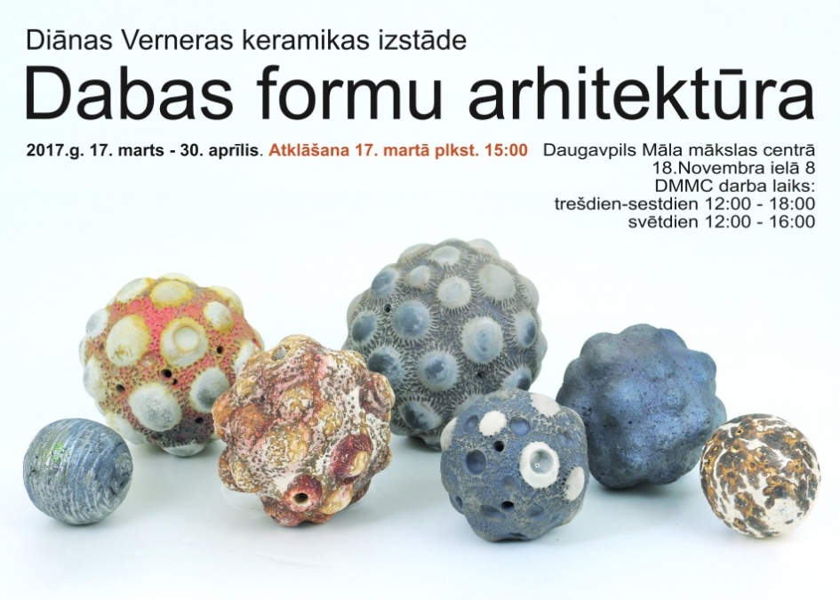 Šī gada 17. martā plkst. 15.00 Daugavpils māla mākslas centrā notiks keramiķes Diānas Verneras izstādes „Dabas formu arhitektūra” atvēršanas svētki. Pati keramiķe atzīst, ka šai izstādei radītie darbi tapuši pēdējo trīs gadu laikā, turpinot dabas formu sinerģijas tēmu. Viņa aicina iepazīt ne tikai keramikas, bet arī citu materiālu daudzveidību, priecāties par krāsu, līniju un faktūru spēli.