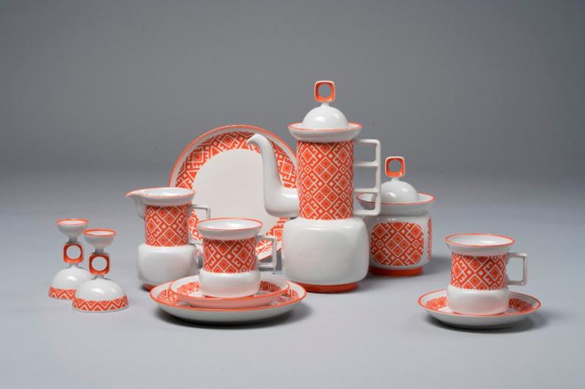 Attēls: Kafijas servīze “Tautiešam apsolīju”. Autordarbs, Rīgas Porcelāna rūpnīca. 20. gs. 70. gadi.