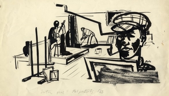 Attēls: Romans Suta. Pašportrets dekorāciju darbnīcā. 1929. Papīrs, tuša. SBM kolekcija