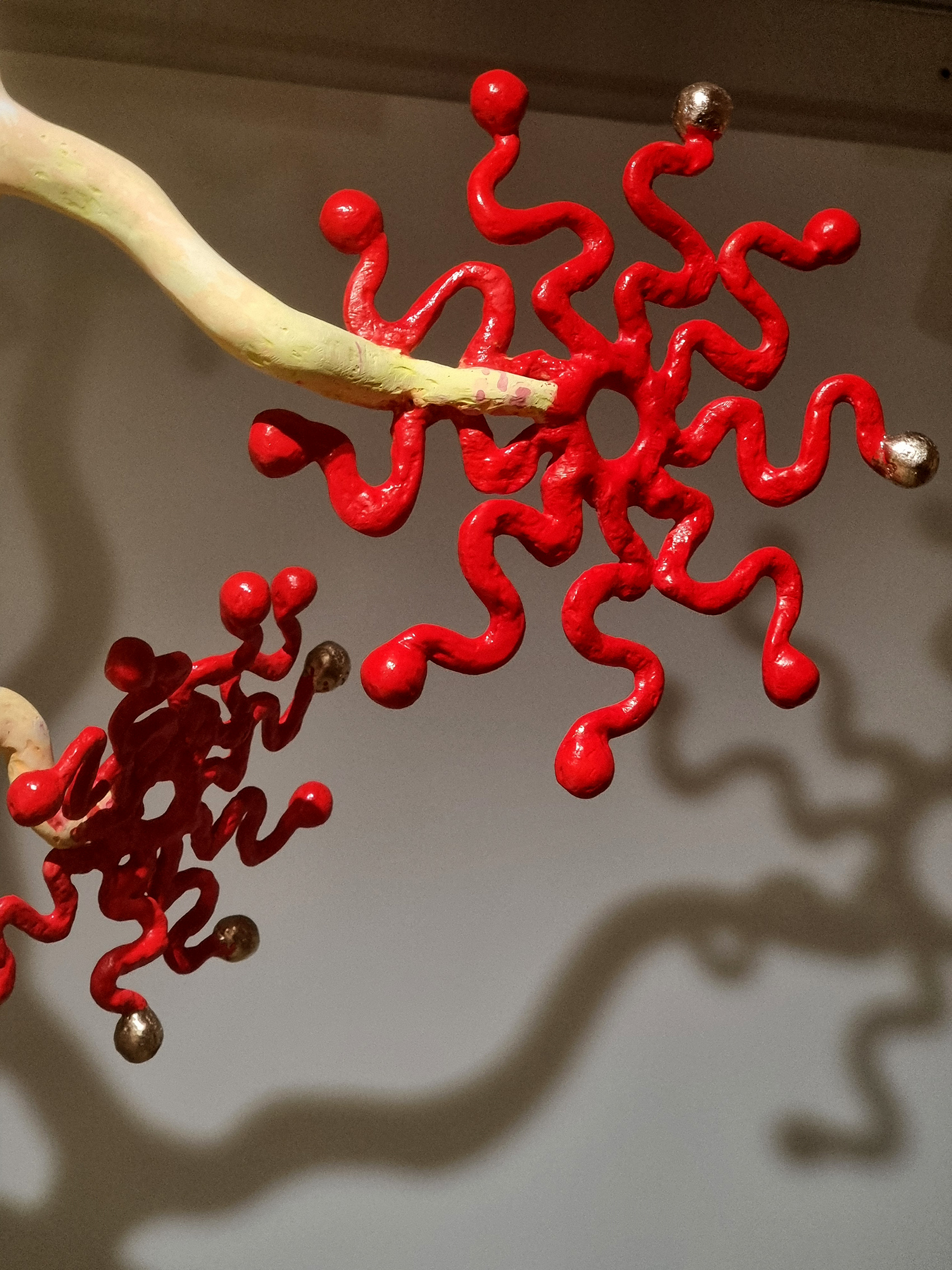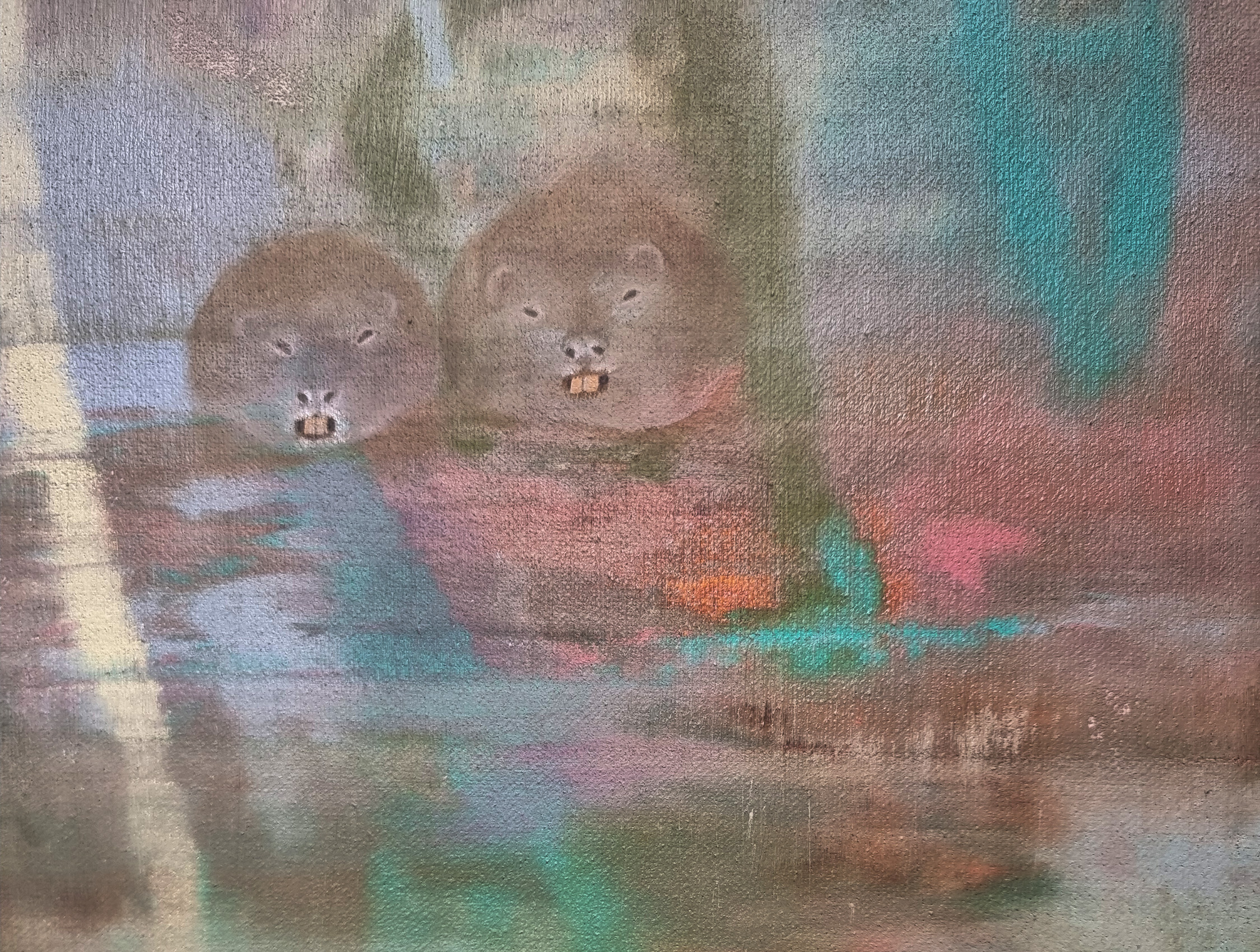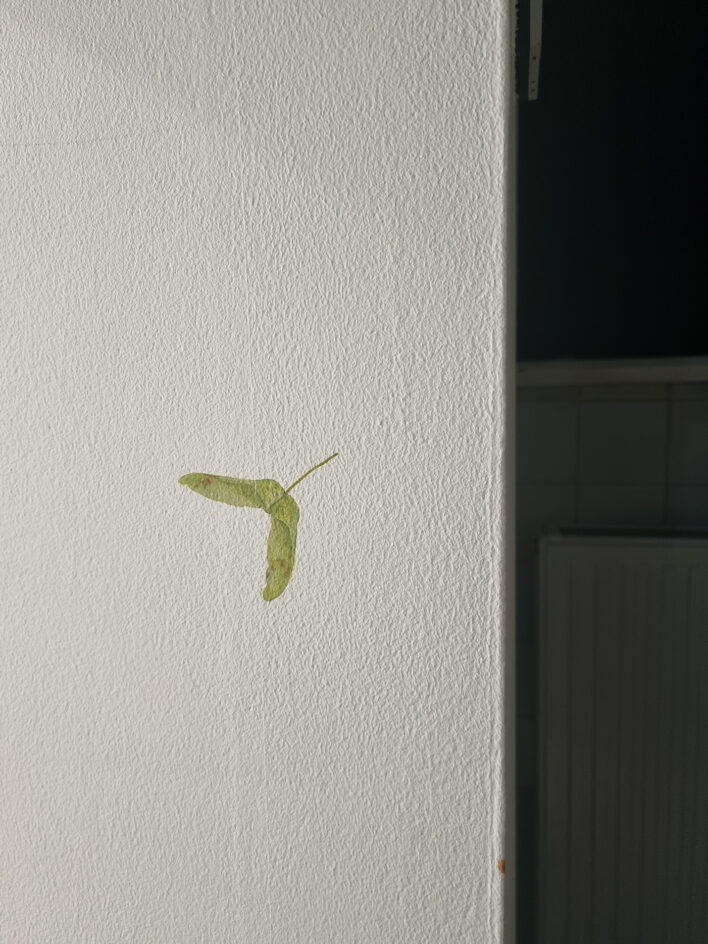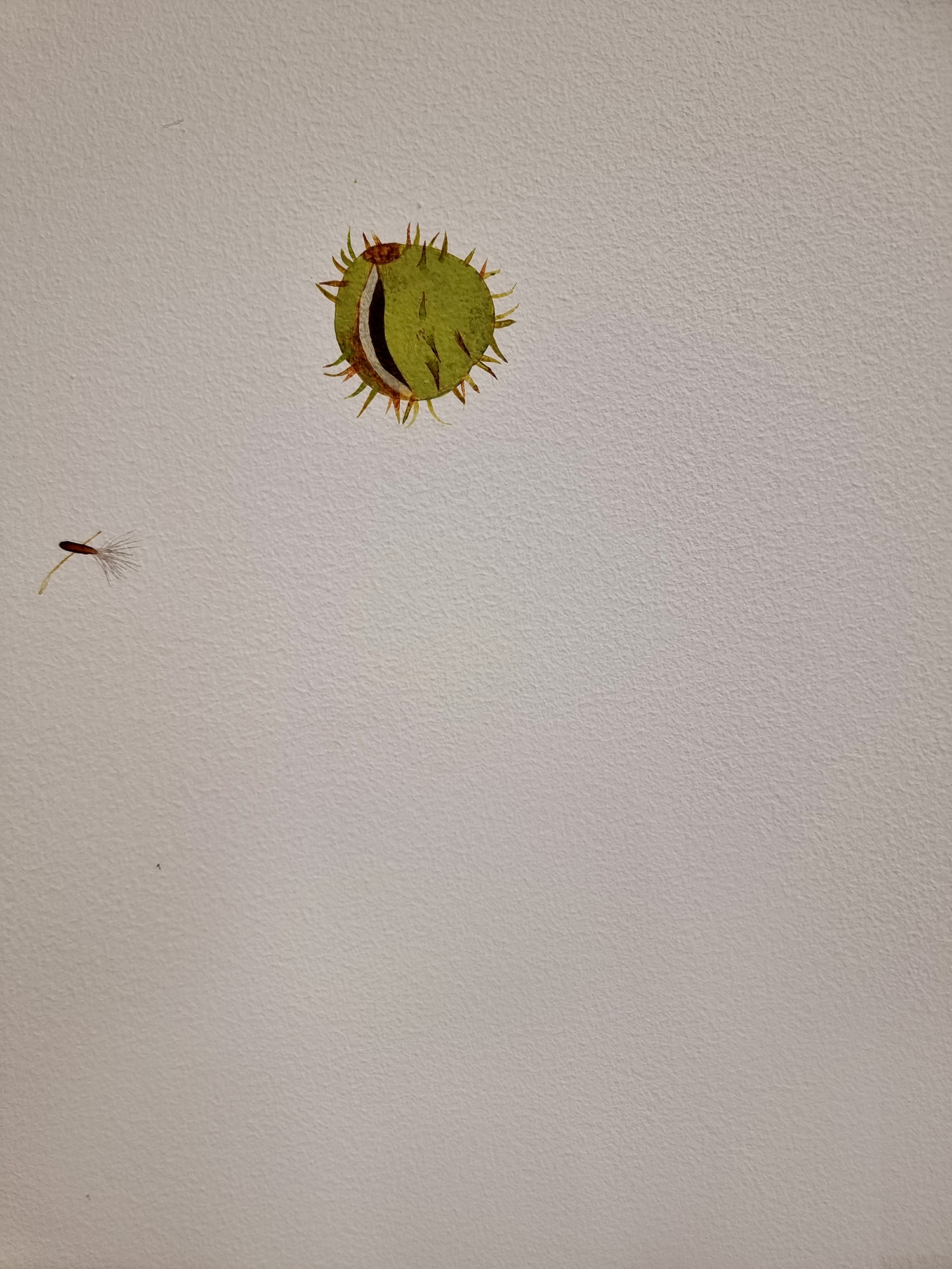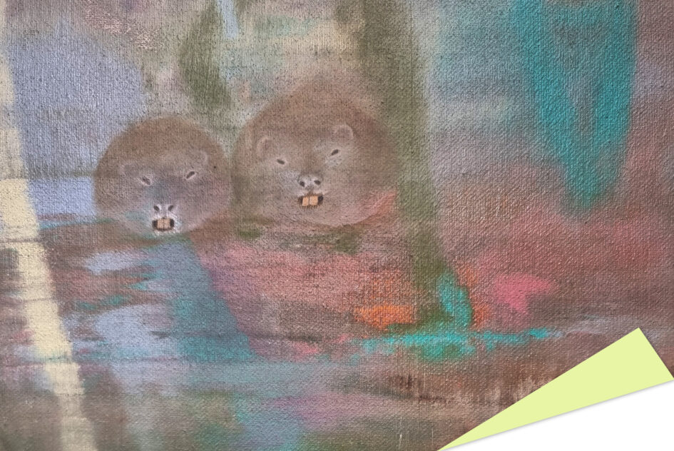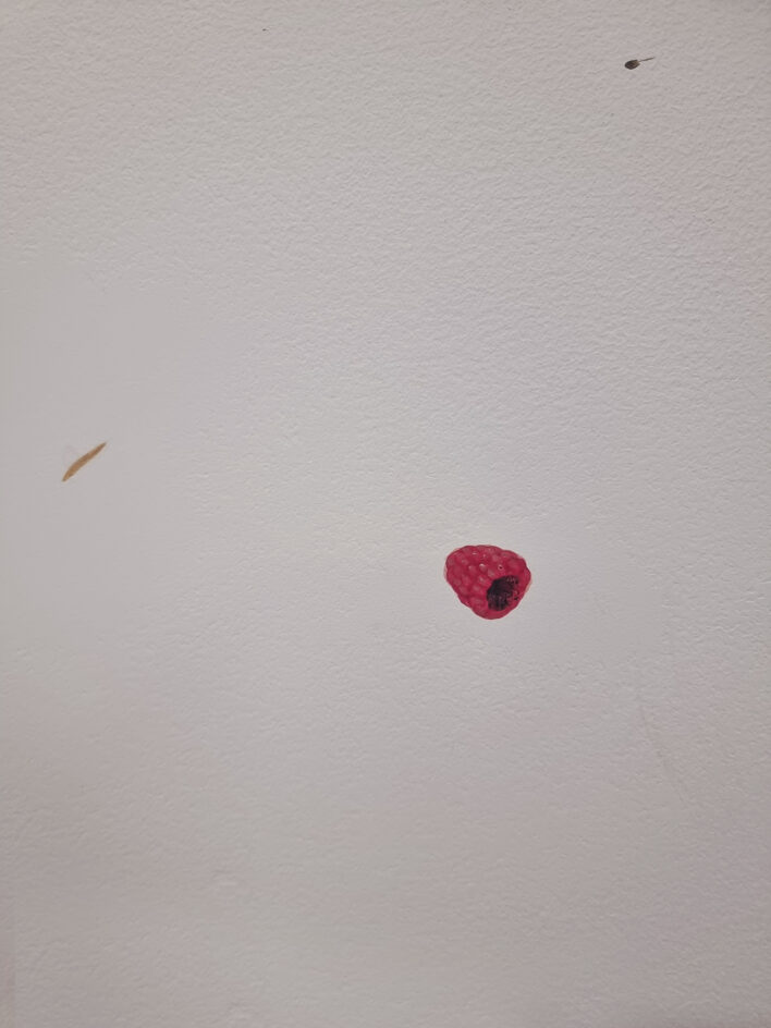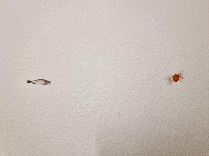 Virzoties tālāk, skatienu uz mirkli mulsina šķietami tukšās sienas. Pirmajā acumirklī tās pat izskatās netīras – it kā no ielas uz tām būtu uzšļakstīti dubļi vai nejaušas ziemas paliekas. Taču pietuvinoties atklājas pavisam cita mēroga pasaule: miniatūras formas, smalki izgleznoti tēli, mikroskopiski objekti, kas piepilda balto telpu ar pavisam citu raksturu. Šis atklāšanās moments ir būtisks un pārsteidzošs – izstāde pieprasa lēnu skatīšanos, uzmanības trenēšanu, spēju pieņemt, ka nozīmīgais ne vienmēr ir liels un uzreiz pamanāms.
