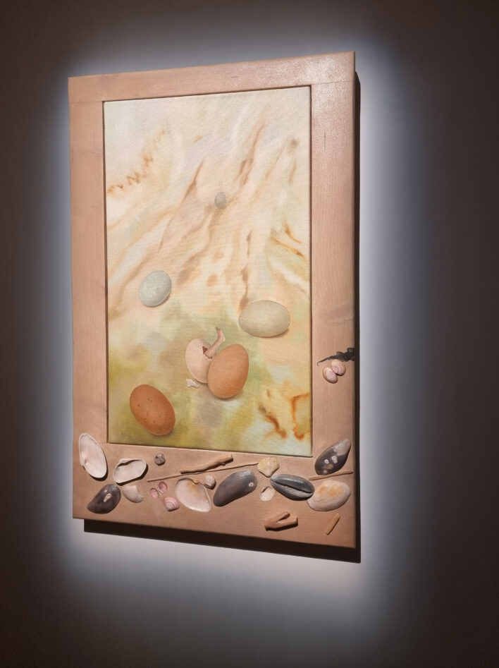 Īpaši spilgti manā uztverē kā arī izstādes tematikā koncentrējas viens ne pārāk “uzbāzīgs” darbs – glezna, kuras rāmī ieintegrēti jūras atradumi: gliemežvāki, oļi, fragmenti, kas vēl nes sevī sāls un ūdens atmiņu. Attēlā redzama ola, no kuras laužas ārā cilvēka kāja. Šis motīvs nav šokējošs, drīzāk klusi satraucošs. Ola kā dzīvības pirmforma, cilvēks kā neatņemama, bet vēl neveikla dabas sastāvdaļa. Šeit cilvēks nav pasaules centrs, bet viens no elementiem – tikpat trausls kā čaula, tikpat pakļauts procesiem kā akmens jūras krastā. Tas ir dzīvības sākums vēl neskartā dabā, pirms pretenzijām un robežām.