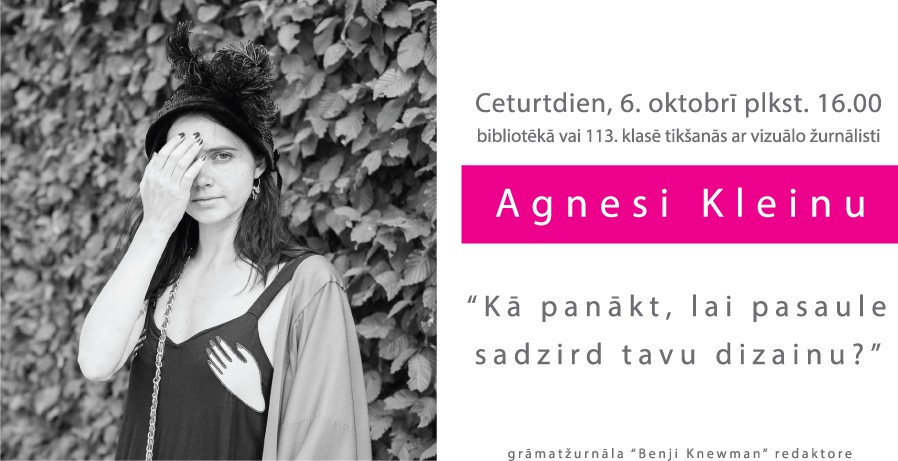 Ceturtdien, 6.oktobrī plkst. 16:00 Profesionālās izglītības kompetences centra “Rīgas Dizaina un mākslas vidusskola” bibliotēka aicina uz tikšanos ar Agnesi Kleinu.